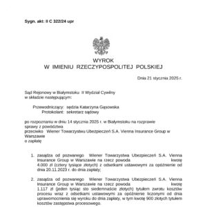 Nasz Klient wygrywa w Sądzie Rejonowym w Białymstoku z Towarzystwem Wiener. W wyroku z dnia 21.01.2025 r. Sąd uwzględnił częściowe żądanie Klienta zasądzenia odszkodowania z ubezpieczenia OC w życiu prywatnym właściciela psa.